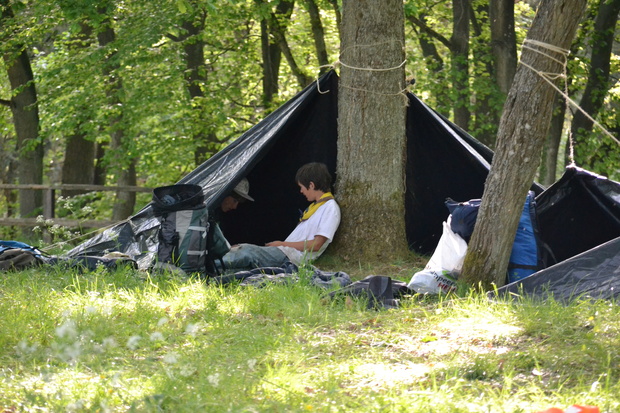 De eerste nacht slaap je nog in een tent, in de Eifel maak je met de andere Scouts een groepsonderkomen met dekzeilen. Een volgende nacht maak je individueel jouw eigen schuilhut, waarin je gaat slapen. De staf legt uit hoe je zo'n schuilhut van landbouwplastic kunt maken.