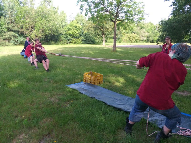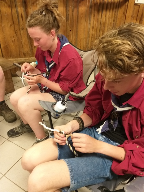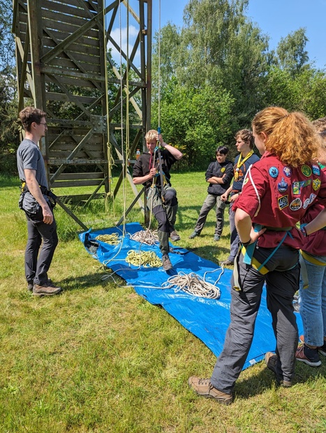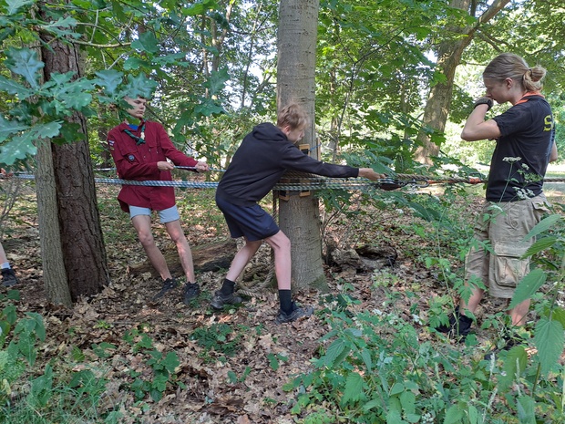 Hierna wordt de groep weer in tweeën gesplitst. De helft die voor de lunch knopen & steken, en sjorringen leerde, gaat naar de tokkelbaan, en de andere helft gaat dus knopen, enz. leren.