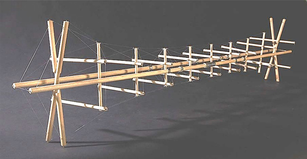 Dan volgt een instructie over: Tensegrity. Tensegrity is een samentrekking van tension en structural integrity. Het verwijst naar de wisselwerking van structuren gebaseerd op een evenwicht tussen trek- en drukbelastingen. De trekkrachten worden opgevangen in flexibele (staal)kabels. De drukkrachten worden opgevangen in staven van staal, aluminium of hout. Aan het eind van deze instructie maak je zelf een simpel object, waarin je tensegrity toepast.