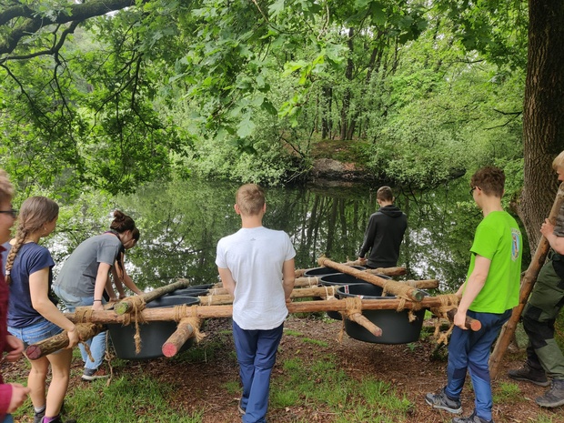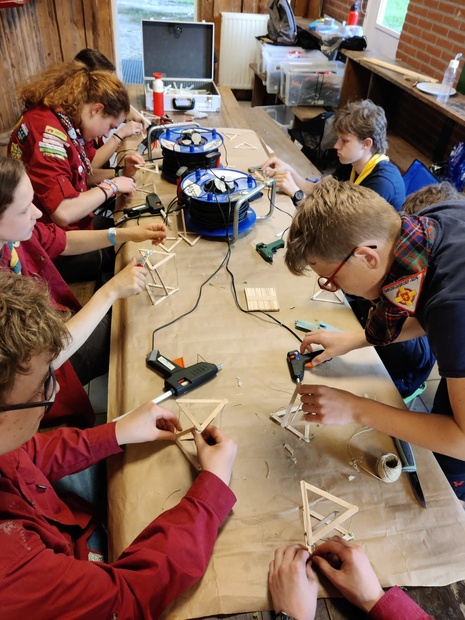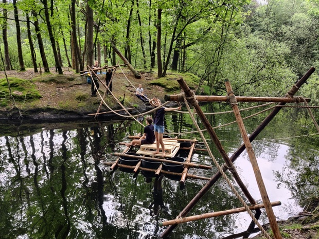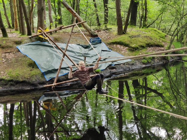Met de andere Scouts, Explorers / Wilde Vaart-leden bouw je 's morgens een tensegrity object en een touwbrug bij ’t Veerhuis en naar het eilandje dat daarvoor ligt. Daarbij wordt het door jullie gebouwde vlot gebruikt om materiaal naar het eilandje te varen.