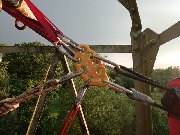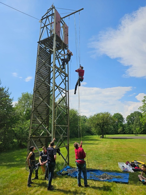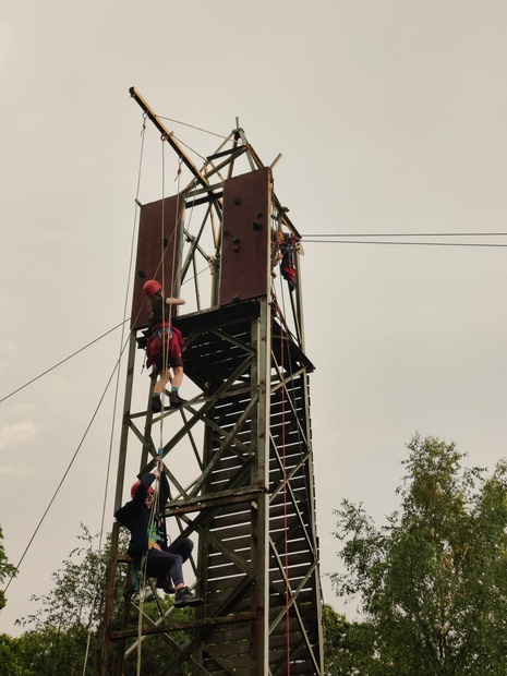 De andere helft van de groep deelnemers gaat vanuit de klimtoren met de tokkelbaan afdalen.