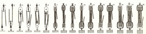 Dubbel jol omgekeerd. 5- Derdehand, krachtsbesparing. 6- Derdehand omgekeerd. 7- Vierloper. 8-