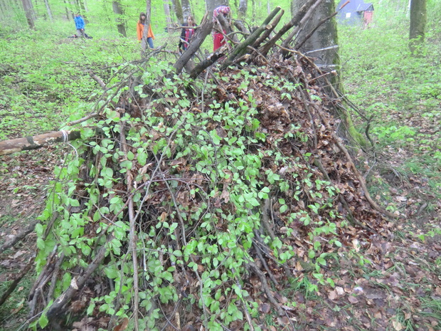 Op het bivak slaap je in een schuilhut van landbouwplastic die je thuis al maakt. In kleine groepjes deelnemers bouw je ook een keertje een primitieve hut van natuurproducten en slaap je daar in.